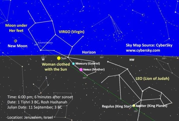Jesus was conceived in Mary’s womb. After a close conjunction of Jupiter and Venus on August 12, Jupiter (the King Planet) began a rare triple conjunction with Regulus (the King Star), essentially crowning it with a halo pattern. The conjunction dates were Sep. 14, Feb. 17, and May 8. The celestial coronation took place in the constellation Leo. Just after sunset on Sep. 11, the constellation that rose in the east behind Leo was Virgo, the Virgin, literally “clothed with the Sun, with the moon under her feet, and on her head a crown of twelve stars” (Rev. 12:1). It was a new moon at her feet, coinciding with the Jewish New Year (Rosh Hashanah). The Magi, familiar with Jewish prophecies of the Messiah, definitely took notice.