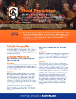 This booklet will help you understand the main arguments for the Real Presence of Christ in the Eucharist, and how to answer the most common objections to this central teaching of the Catholic Church.