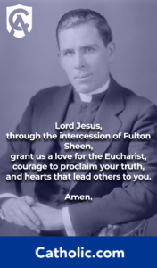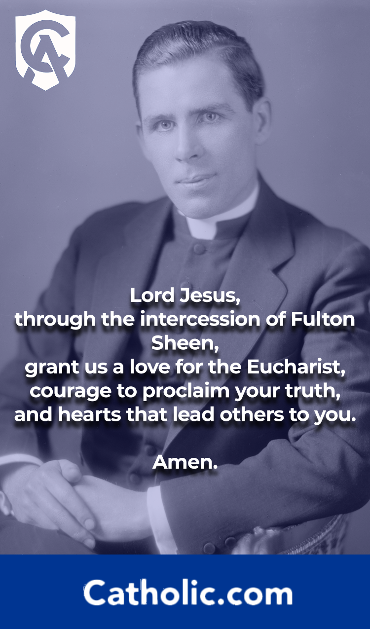 Lord Jesus Christ, you gave your servant Fulton Sheen a burning love for the Eucharist and a gift for proclaiming your truth with clarity and charity. Through his intercession, draw us into deeper prayer, stronger faith, and a joyful courage that does not fear the world. If it is for your glory and the good of souls, advance his cause and raise him up among the saints of your Church. Amen.