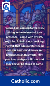 As a Samaritan, she belonged to a group tragically separated from the Jewish people (see above). This makes the meeting of Jesus with the Samaritan woman at the well especially significant. Instead of avoiding her, Jesus speaks to her directly, revealing that the Catholic faith is for all people. Her story shows that God’s grace reaches beyond divisions and calls each person into communion with him (John 3:16; see 2 Pet. 3:9).